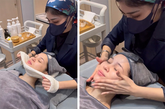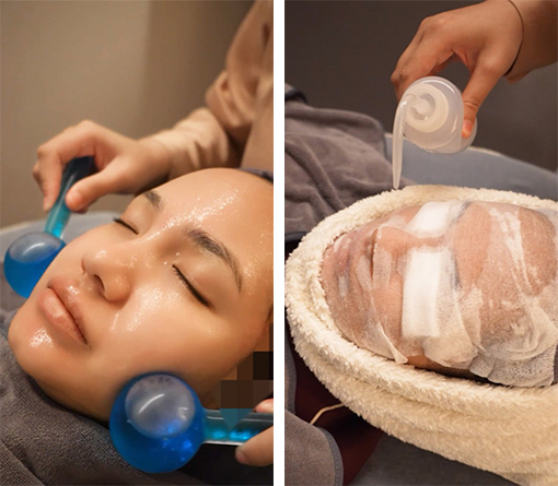 Begin with a gentle cleanse and exfoliation to prep the skin for maximum absorption. Hydration-boosting serums are layered in using gentle massage and infusion techniques, followed by a cooling mask and glow-enhancing finish.